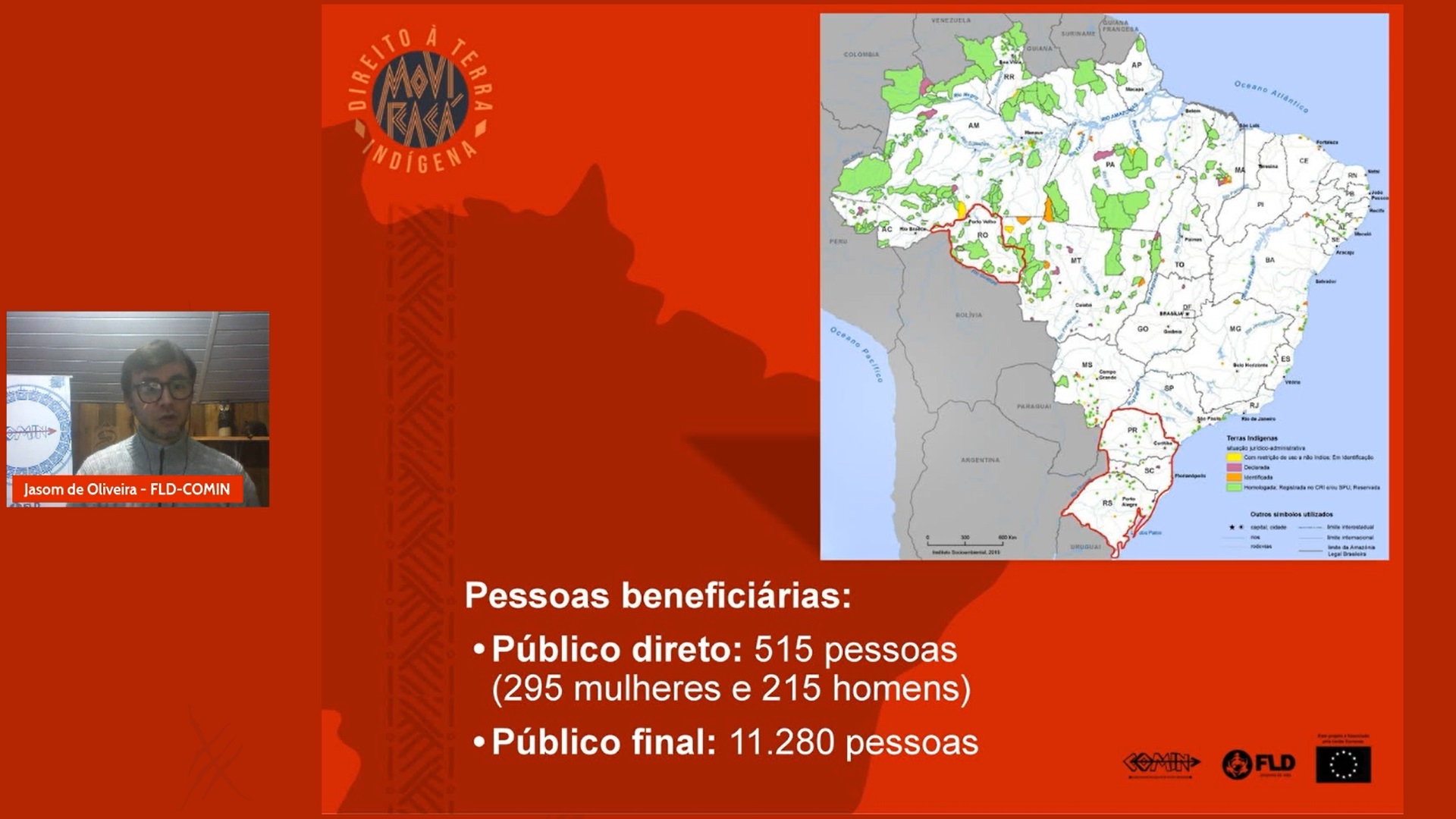 Ao todo, mais de 500 pessoas estarão envolvidas no projeto e cerca de 11 mil serão beneficiadas, segundo apresentou o coordenador de projetos de FLD-COMIN, Jasom de Oliveira. O projeto tem como grupo-alvo lideranças e representantes de 99 comunidades de 14 povos indígenas, bem como de 15 organizações indígenas da região Sul e do estado de Rondônia.