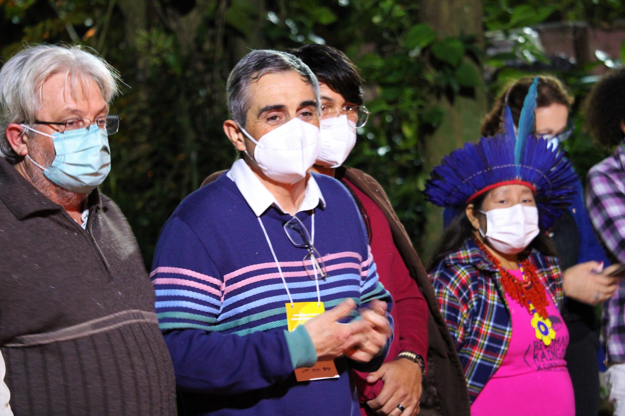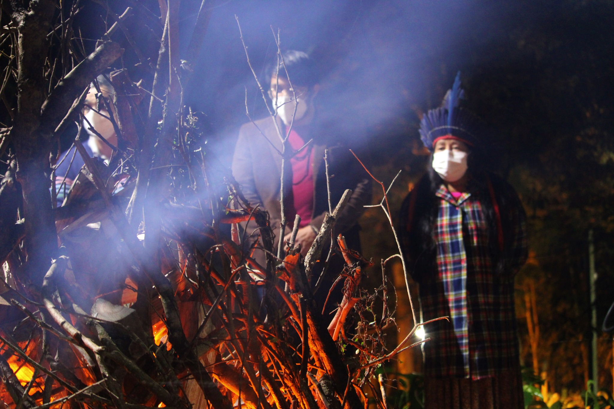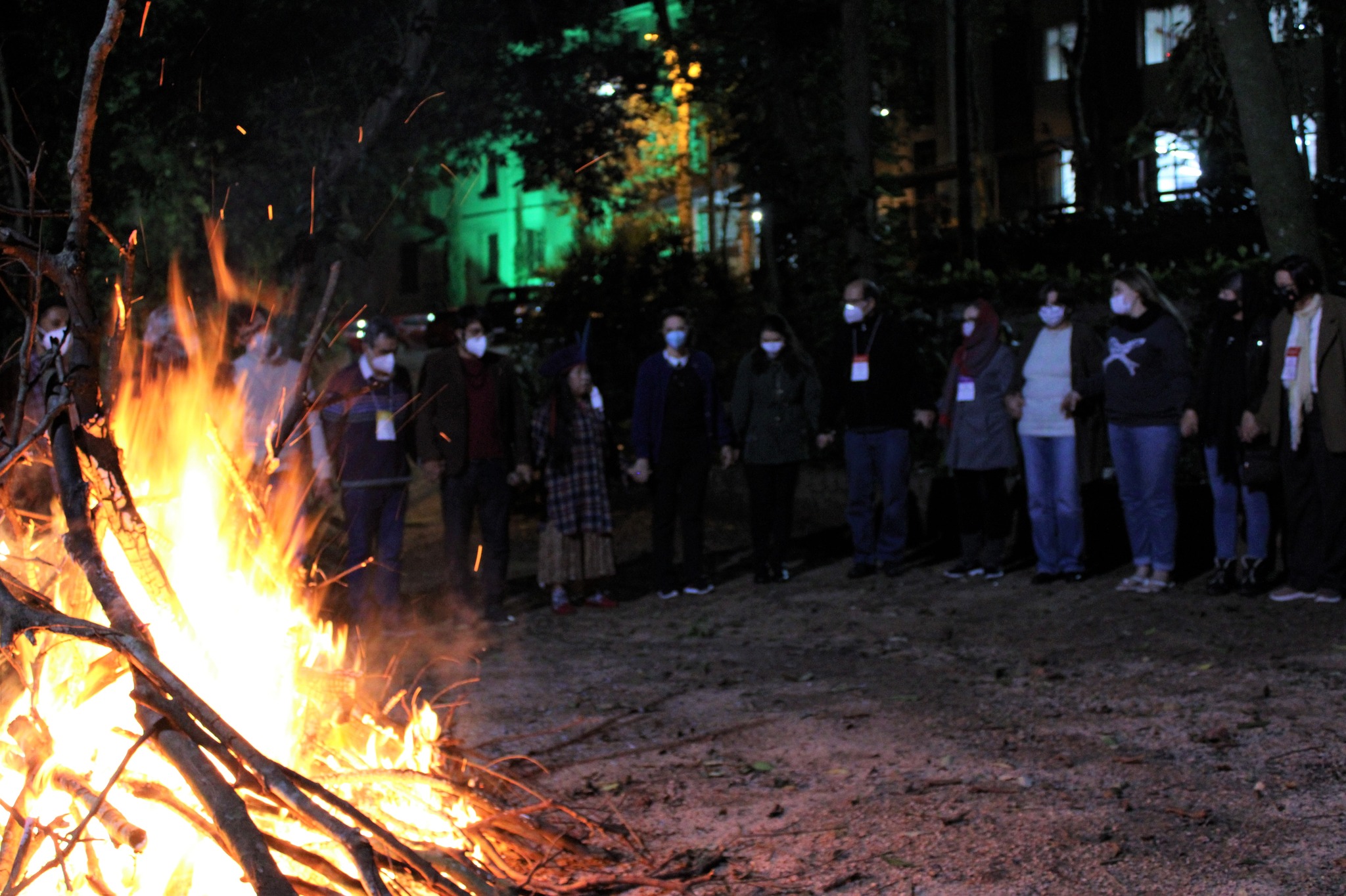 À noite, houve um momento cultural onde uma grande fogueira foi acesa com a presença da Kujã Kaingang, Iracema Gãh Té Nascimento, e do coordenador do Conselho Indigenista Missionário – CIMI Sul, Roberto Liebgott. “O COMIN e o CIMI surgem da mesma essência evangélica: estar com aquelas e aqueles que mais precisavam de vida, esperança, terra e direitos”, ressaltou Roberto. As pessoas foram convidadas a colocar gravetos na fogueira e Iracema explicou que esse ato coletivo representava o fortalecimento da causa indígena: “Aqui falo eu, mas atrás de mim está um povo e todo o movimento indígena.”