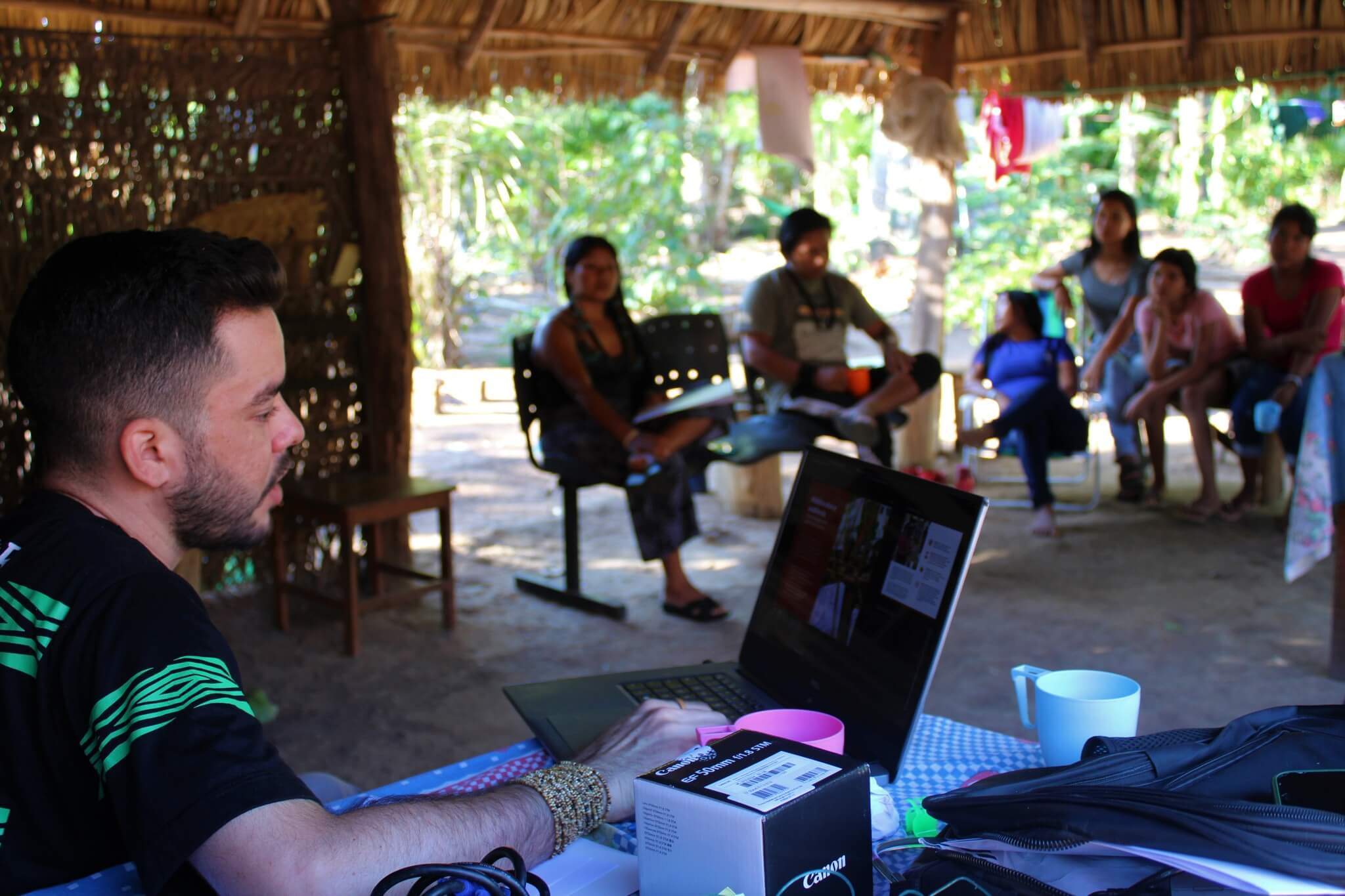 No segundo dia, as mulheres aprofundaram-se nos métodos do Instagram e trabalharam com foto e vídeo, produzindo conteúdo para as redes da AGIR. À noite, o grupo assistiu a uma exibição especial do documentário “O Território”, junto às famílias indígenas da aldeia. Ao final da exibição, todas e todos debateram sobre as temáticas trazidas pelo filme, que retrata a luta do povo Uru Eu Wau Wau contra a invasão de seu território. Um dos destaques foi o uso da tecnologia para monitorar essas invasões e a comunicação como ferramenta de denúncia.