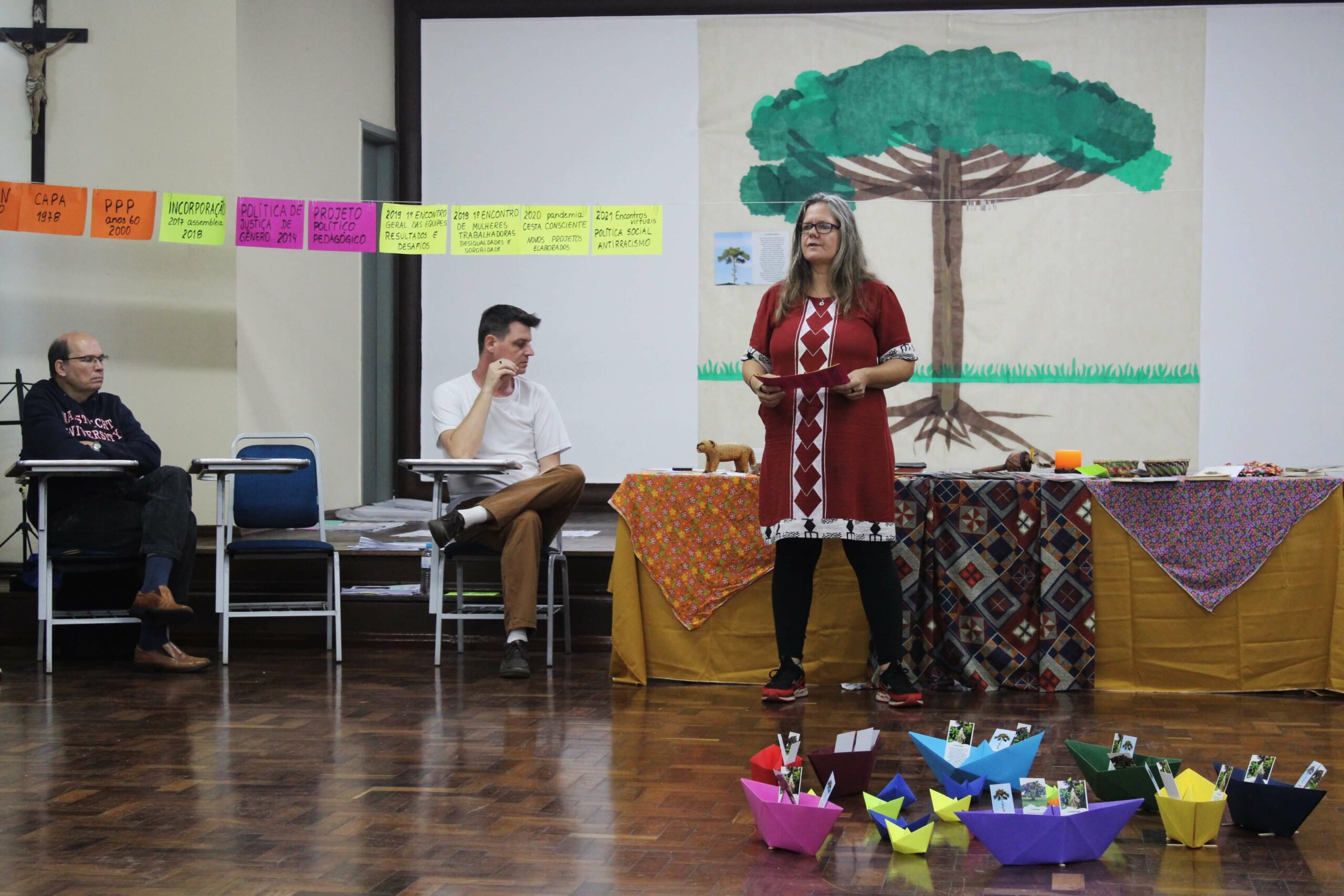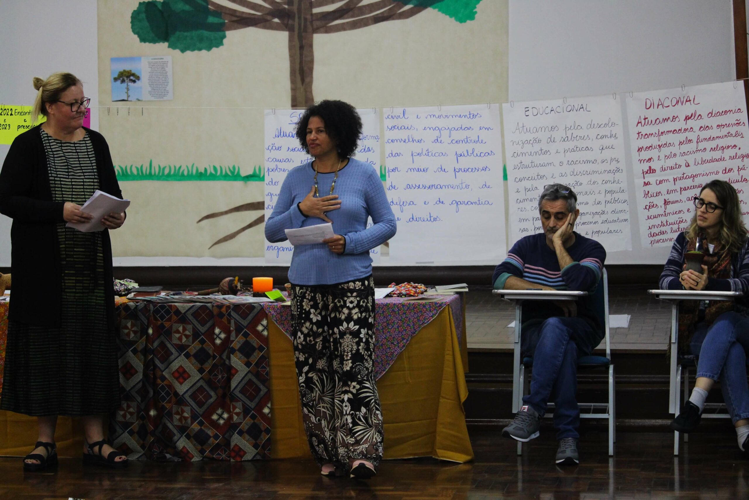 Para esse momento de partilha, mediado por Julia Witt, coordenadora do PPP, estiveram presentes Maria Rejane Aurélio da Silva, da Associação Mulheres Educando e Semeando (AMES), de Porto Alegre, e Sueli Angelita da Silva, da Associação de Artesãos da Feitoria (ASAF), de São Leopoldo (RS), mulheres que fizeram a revisão do caderno e contaram sobre a experiência dos projetos das suas organizações que foram apoiados pelo programa.