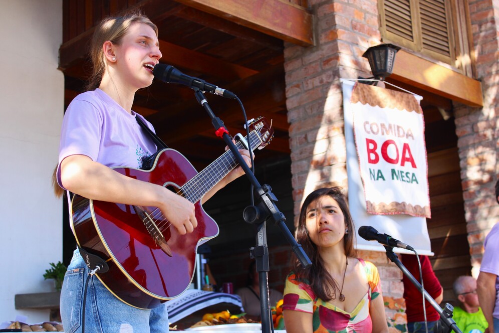 A comemoração reuniu agricultoras e agricultores, pessoas associadas e parceiras e parceiros da cooperativa e representantes do governo municipal e da Fundação Luterana de Diaconia (FLD) e seu programa CAPA núcleo Santa Cruz em um potente encontro que também celebrou a agroecologia e a diversidade. As pessoas que passaram pela feira foram acolhidas com música ao vivo da Bruna Ave Cantadeira e Tatiana Pureza e puderam degustar diversos alimentos.