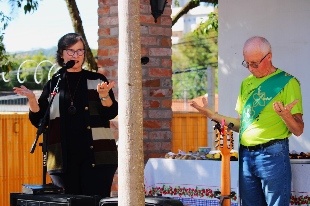 Durante a celebração, houve momento de benção da Pastora Emérita da Igreja Evangélica de Confissão Luterana no Brasil (IECLB) Anelise Abentroth, do Sínodo Centro Campanha Sul, e do Diácono Clécio Weber, da Diocese de Santa Cruz do Sul. Ambos ressaltaram a importância da agroecologia em defesa da vida e por comida boa na mesa. Esteve ainda Oscar Stumm, presidente do Sínodo Central Campanha Sul.